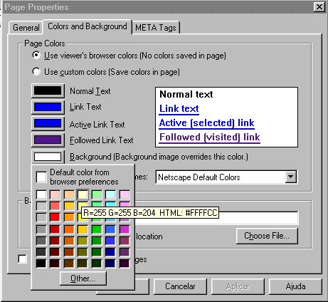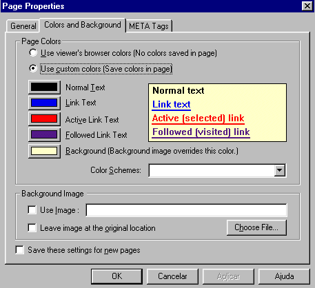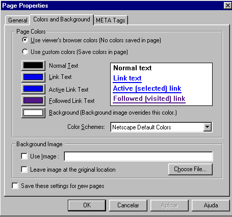 a janela abaixo, nesta escolha a aba Colors and Background.